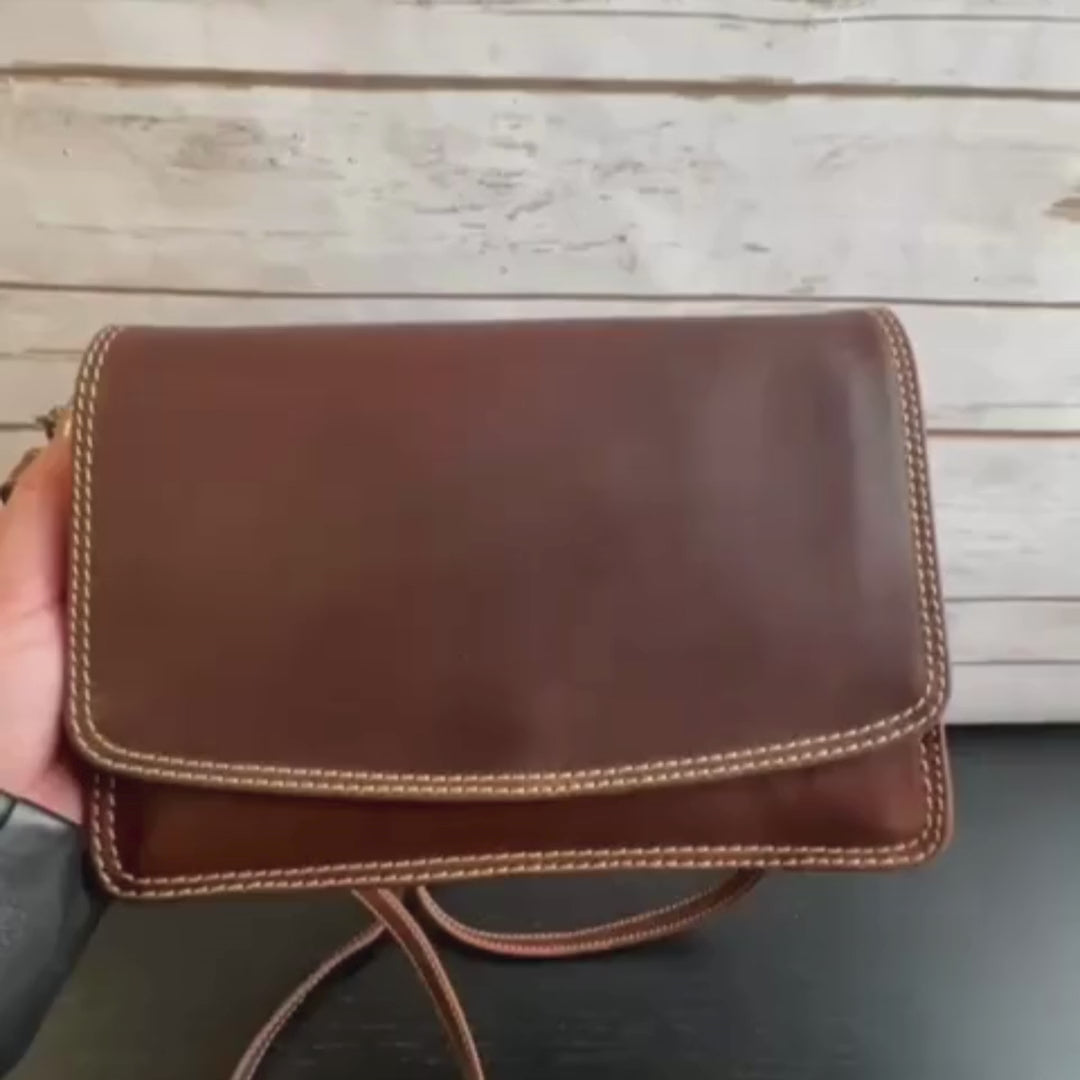 This compact yet versatile full grain leather purse is perfect for staying organized on the go. Measuring L: 2.5″, W: 8″, H: 5.5″, it features a front flap and an inside zipper for secure storage. The interior includes a zippered dividing compartment and several card slots, keeping your essentials neatly in place. A back zipper offers additional quick-access storage. Designed for convenience, it comes with an adjustable and removable strap (up to 66″), as well as a removable 8″ hand strap for versatile carrying options. The purse is lined with 100% cotton, providing durability and a soft touch.