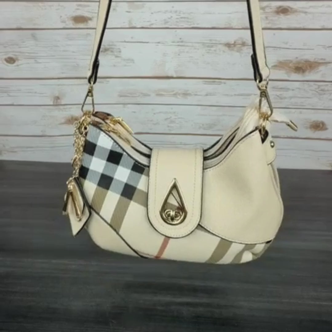 Infuse your wardrobe with classic sophistication with the Temptation Italy Small Plaid Faux Leather Shoulder Bag. This elegant crescent-shaped handbag features a striking diagonal design, pairing a timeless beige, black, and red plaid pattern with a crisp, cream-colored pebbled faux leather panel. The front is accented by a decorative flap featuring a unique, teardrop-shaped gold-tone hardware detail that adds a luxurious focal point.